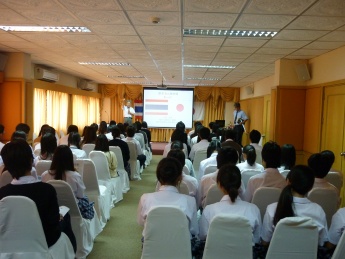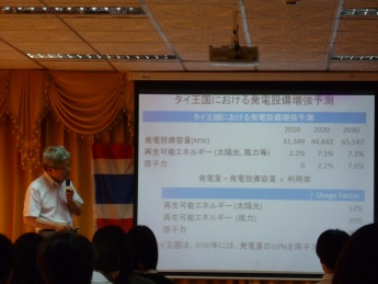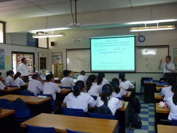 ワット・ラジャ・オ・ロス校の1年生21名の生徒を対象に英語による模擬授業、如水館バンコク校(高等部)では、約70名の1~3年生対象に、日本語による模擬授業を行いました。両校において、「原子力・放射線を易しく解説」のテーマで、原子力・放射線は、137億年前のビッグバンから始まり、現在では、エネルギー、医療、農業、工業などに幅広く使われていることについての説明がありました。また、核融合炉が実現すると、人類が存続している限り、エネルギー供給には問題なくなるなど、将来のエネルギーについての説明もありました。高校生からは、「福島原子力発電所事故の影響について」、「時間旅行は可能か」などの質問もだされました。