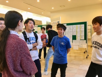 研修に参加した18名の学生が3名1チームのグループを作り、研修中に体験したことや感じたことを取り入れたポスターを作成し、そのポスターをもとに情報や意見交換が行われました。