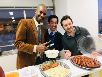 12月19日(木)16時より基盤教育機構の外国人教員主催によるAustralia Partyを開催しました。65名を超える大盛況の中、オーストラリア出身の教員からクイズを交えた歴史や文化を学びました。その後、準備していたオーストラリアのサンドウィッチとチョコレート菓子(ティムタム)がふるまわれました。サンドウィッチは日本のものとは異なり、食パンの上にソーセージ、炒めた玉ねぎ、ケチャップ、マスタードをかけたものでした。初めて食べるオーストラリアサンドウィッチにおかわりをする学生もいました。