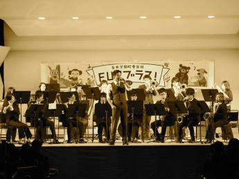 午前中は主にリハーサルを行い、午後から合同演奏会「FUTブラス!5」が始まりました。 福井工業大学応援団吹奏楽部の単独演奏で幕開けし、その後は本学留学生が部員の演奏をバックに「September」を歌い、その後中学2年生と福井高校で総勢96名、高校生と大学生で総勢106名という大人数で奏でる2つの合同演奏が行われました。とても迫力があり、かつ重厚なサウンドで圧巻の演奏でした。高校生と大学生の合同演奏では、行進曲「アルセナール」を演奏し、華々しくかつ大感動に包まれ、演奏会の最後を飾るにふさわしい演奏でした。大感動の余韻が残り、惜しまれつつではありますが、「FUTブラス!5」全てのプログラムを終了致しました。
