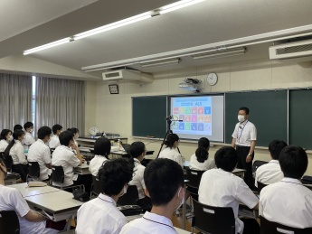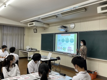 7月12日(月)は、特別進学コース2年生にむけて、環境情報学部 環境食品応用化学科教授の矢部 希見子先生が講師を務め、SDGsゴール2「飢餓をゼロに」に関する食品のカビ毒汚染について講義を行いました。食品のカビ毒汚染がどのように生じるのかを解説した後、穀物のカビ毒汚染が原因となり国家間で生じている不平等を解決するために、もし自分が国の最高責任者だったら何ができるのか、グループに分かれて発表してもらいました。