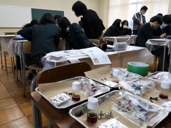 さらに応用編として、「色素増感太陽電池」を自分で作成してもらい、実際に光を当てることでモーターが回転する場面を教室で体験してもらいました。途中多少トラブルもありましたが、最後には全員が実験に成功。目の前で回るモーターを見ながら光が作りだすエネルギーの化学を感じることが出来ました。高校の先生からも、「授業で学んでいる化学の現象を、楽しい実験を通して体感させていただきありがたかった。」とのお言葉をいただきました。