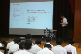 当日は、授業科目「工業技術基礎」の特別講義として、「プロダクトデザイン・ユニバーサルデザイン」をテーマに、「デザイン」、「プロダクトデザイン」、「ユニバーサルデザイン」についての解説、身近なデザインの紹介等を通して、プロダクトデザインとユニバーデザインについて学びました。講義を受けた後は、生徒の皆さんにユニバーサルデザインに関する演習に取り組んでいただきました。