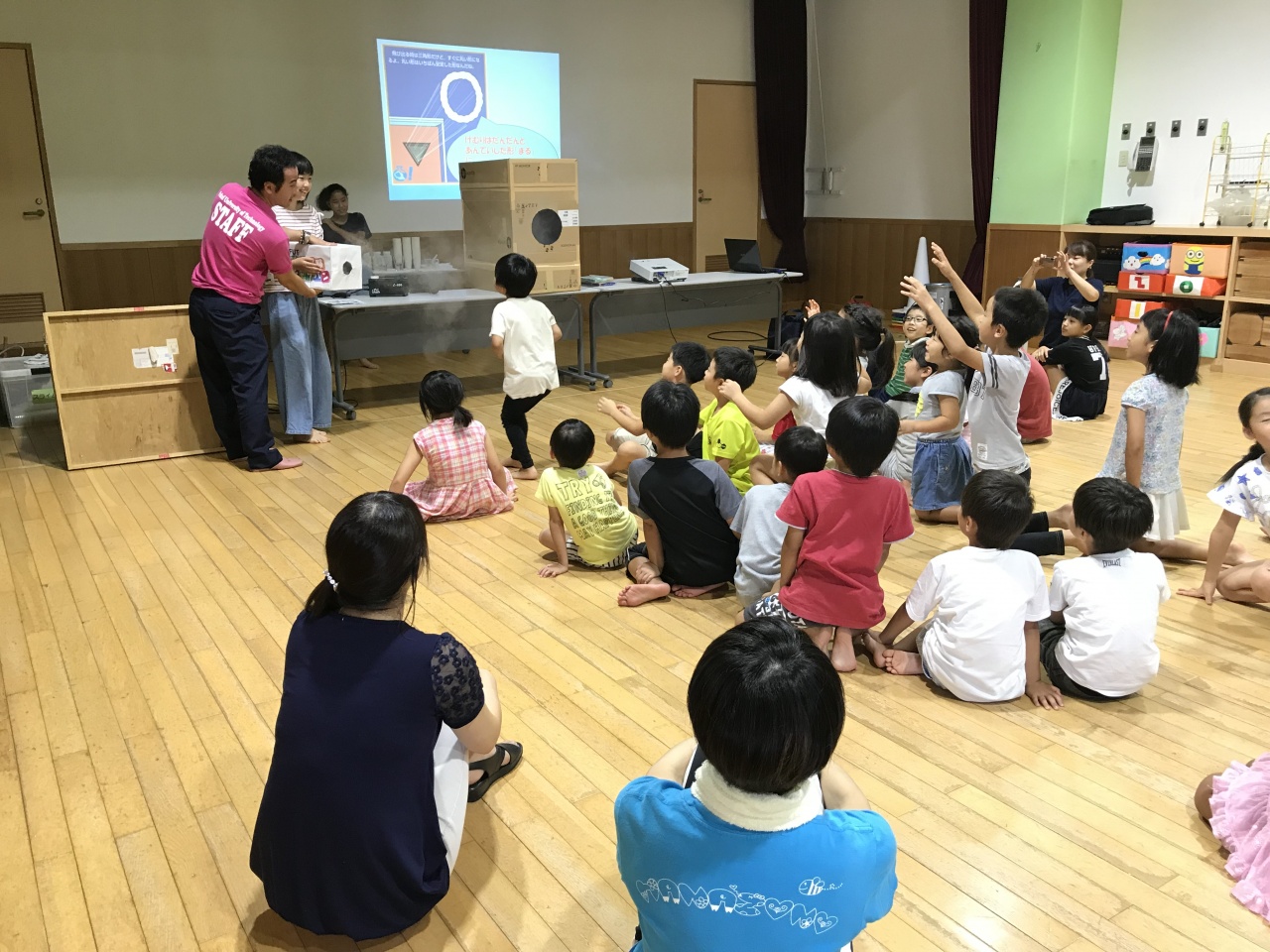 「なんでも浮いちゃう魔法の風」では、大きな丼ぶりやサイコロが宙に浮いているのを見て、声を上げて感動してくださいました。また、「空気の形を見てみよう」では、空気砲から出る円形の煙(空気)に大変驚き、煙(空気)に触れようと立ち上がる姿がたくさん見えました。そして、「天然素材でできたエコなはちみつスライムを作ろう」では、ご自分で作ったスライムをお友達と見せ合ったり、より長く伸ばして遊んでいる姿が拝見でき、とても楽しそうに科学に触れてくださいました。