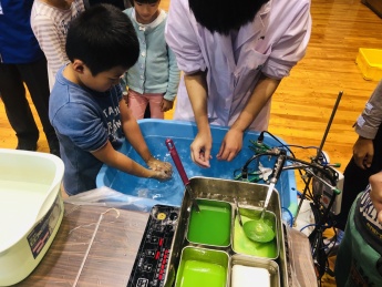 2019年10月16日(水)、あわら市が実施する「生き活きライフセミナー」の一環として、小学生を対象にあわら市中央公民館にて科学実験キャラバンを実施しました。今回はものづくり実験として、教員2名、学生スタッフ7名のもと、食品サンプルづくりを実施しました。この日のメニューは、「天ぷら」と「レタス」でした。天ぷらは、好きな具材を選んで自由に色づけした後、温めてトロトロになったロウをお湯の中に浮かべ、具材に巻きつけて衣付けをしました。レタスは、お湯に浮かべた黄緑色のロウをゆっくりと水中に引き入れることでロウが薄く広がり、それをふんわりと丸めることでレタスを形作りました。子どもたちは、水中で様々な形に変化するロウを使って、リアルな食品サンプルづくりを楽しんでいました。参加してくださった皆さん、ありがとうございました。