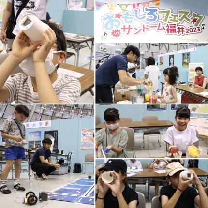 記録的な猛暑続きの今年の夏休み。後半では、丹南地区のものづくり企業や大学、高校などのブースが並び、親子連れで楽しむことができるイベント「おもしろフェスタin サンドーム福井」を皮切りに、近隣地区の公民館、福井市男女共同参画の推進イベント(福井駅前アオッサ)、福井市内の児童クラブにも出かけてきました。