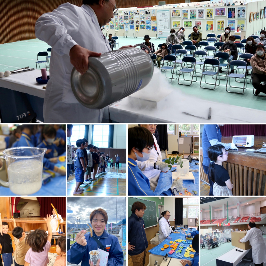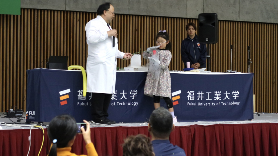 校舎の窓から一面に越前海岸の美しい海が見渡せる越前町城崎小学校では、先生方と保護者の皆さんが協力して実施する交流イベントが開催され、私たちは「サイエンス」分野の体験授業をお手伝いさせていただきました。その日の午後からは、勝山市の男女共同参画を担当されている方々により2日間開催された市民文化祭「勝山WAKUWAKU文化フェスタ」の会場へ移動して、メインステージの最後のメニューとして砂川武義教授のトークも楽しい「科学実験ショー」を文化祭に参加されていた幅広い年代の皆様に楽しんでいただきました。
