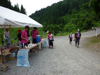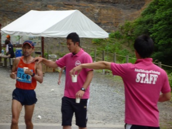 給水補助は3名づつ20キロコースの途中と折り返しに分かれて走ってくるランナーにスポーツドリンクや水を渡す仕事であり、ランナーを間近で見て息遣いを感じながら、疲れの出てきているランナーに対して激励の声をかけていました。