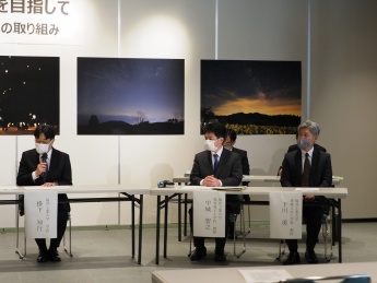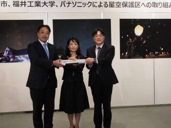 10月29日(木)、大野市、パナソニック株式会社ライフソリューションズ社、本学の3者による、国際ダークスカイ協会(IDA)による星空保護区制度「アーバン・ナイトスカイプレイス部門」の申請を令和5年度に行い、アジア初となる認定を目指す発表を行いました。本学からは、掛下 知行学長、工学部電気電子工学科 中城 智之 教授、同学部建築土木工学科 下川 勇 教授が出席されました。