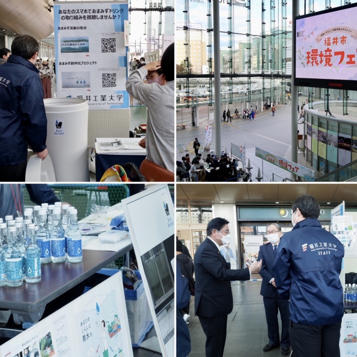 会場入り口に設けられた「あまみずドリンク」紹介ブースでは、貴重な雨水の資源化について考えるパネル展示の他、主催者の方と協同してこのあまみずドリンクの試飲や販売も行い、福井市副市長も蔵田学長補佐と歓談しながらその爽やかな飲み口を確かめておられました。