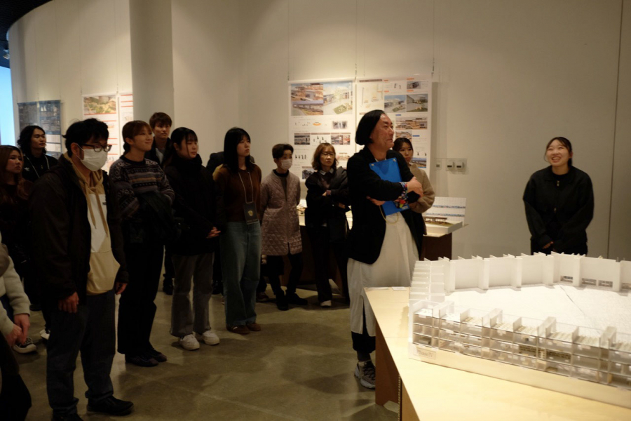 また、会期中には建築家 木村吉成さんの講演会を開催しました。柱や梁などの「架構」が、構造的機能の面だけではなく、建築に住まう人やその土地や地域に対しても積極的に介在する、重要なデザイン要素であることを作品を通じて解説いただきました。学生たちは木村さんのデザインの手法や姿勢に強い刺激を受けました。その後、実際に展示されている作品について講評も賜り、学生たちも真摯に聞き入っていました。