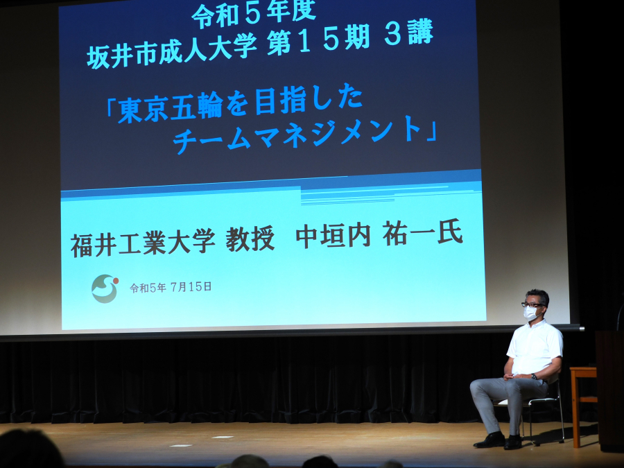 スポーツ健康化学科の中垣内祐一教授は、坂井市から「坂井市成人大学」の講師のご依頼を受け、150名を超える一般市民の皆さまの前で「東京五輪を目指したチームマネジメント」題し90分に亘る講演を行いました。東京五輪での男子バレーボール日本代表を指揮した経験をはじめ、これまでの選手育成の中で培われたチームマネジメントの極意を、親しみやすい語り口で披露し、参加した皆様から笑いや納得の声が何度も漏れ聞こえてまいりました。