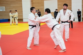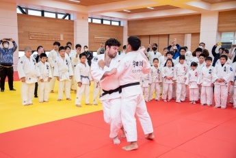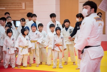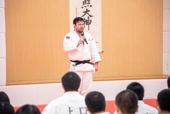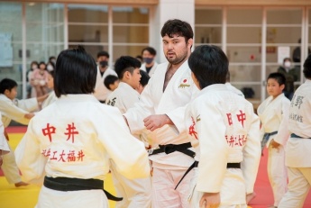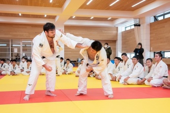 なお、講演会にさきだち午前中に学園武道場「武徳殿」にて行われていました、柔道の稽古にサプライズで登場し、即席の柔道教室を開催しました。突然のウルフ選手の登場に参加していた小中高生は、目を丸くし喜んでいました。