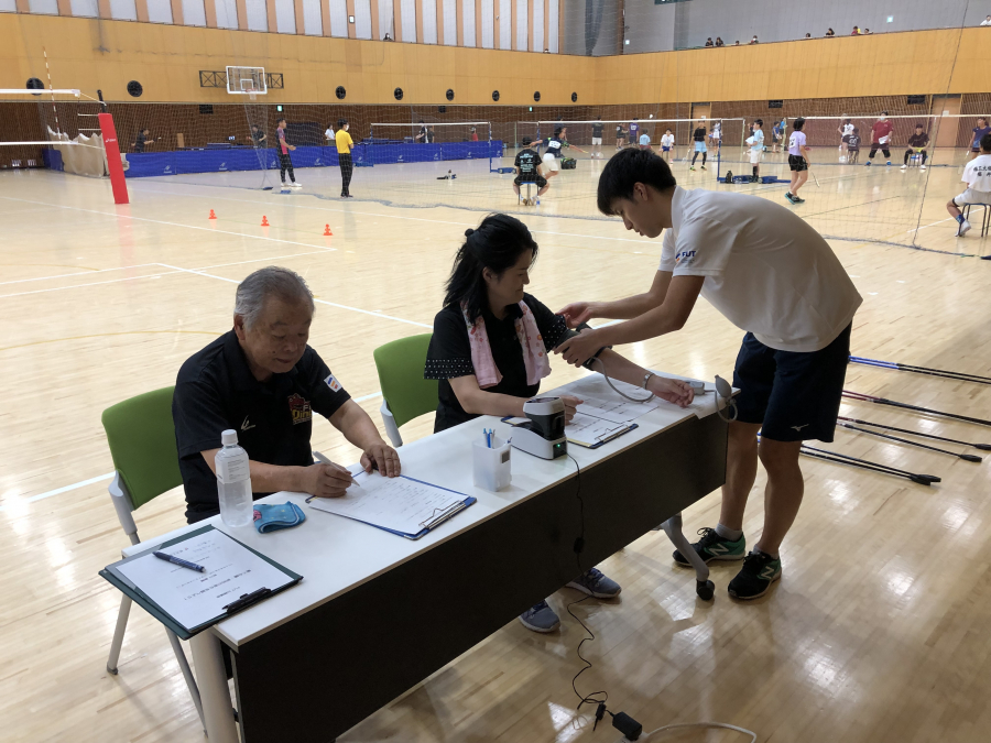まず参加者は健康状態をチェック、そして心拍数と脈拍数を調べるセンサーを装着し学生3名と一緒に準備体操をし、リズムに合わせて体育館コートを歩きました。歩く速さの違いで心拍数・脈拍がどのように変わっていくかを調べてました。結果を見ることにより各々にあった運動量を確認できました。次にノルディックウォーキングに挑戦。体の負担が軽減されることを体感しました。参加された方は健康意識が高くスポーツジムにも週4回通っているとのことでしたが、来年も参加したいとの感想をいただきました。