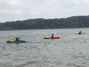 まず、全員で準備体操をし体をほぐしていただきました。続いて、実際にパドルを持ち水上での動かし方を学んでいただきました。初めてパドルを持った方が多く、最初は見よう見まねでの練習を繰り返し行っていただきました。そして、北潟湖に入り実際の水上でのパドルの動きを念入りに練習していただきました。陸上での練習成果があり、水上での実践はスムーズに行うことが出来ました。