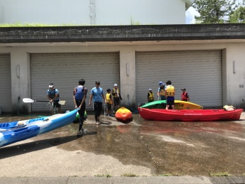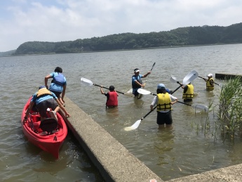 続いて、いよいよカヌー&カヤックを体験していただました。本学のカヌー部員の補助もあり、経験者の方はより上達し、初心者の方々も終盤ではご自身の力で漕ぐことが出来ていました。初めてのこともあり、陸上に上がった頃には全力を出し切ったのか少し疲労の様子も見えましたが、「楽しかった!またやりたい!!」という声をたくさんいただけたので、充実したお時間を過ごしていただけたと思います。