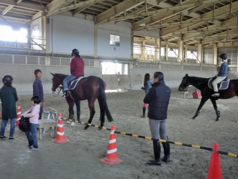 吉村講師から馬と触れ合う時の注意事項についての説明を受けた後、早速、乗馬体験。最初は怖がっていた方も、慣れるにつれて非常に楽しそうに乗馬をしていました。その後は、馬へのエサ(人参)やり。最初、エサをあげるタイミングが合わず、馬がうまく食べられない時もありましたが、徐々にコツをつかみ、楽しそうにエサやりをしていました。