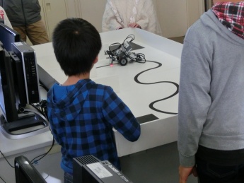 その後、WROベーシック競技 福井大会で使用したロボットコースを用いて、「黒いラインの上を走る(ライントレース)」などの課題を設け、プログラムを作成しました。コース上の黒ラインからロボットが外れて走るなどの失敗をすると、プログラムを何度も修正し、成功するまで挑戦する姿が見られました。成功した時には非常に嬉しそうな表情をしていました。