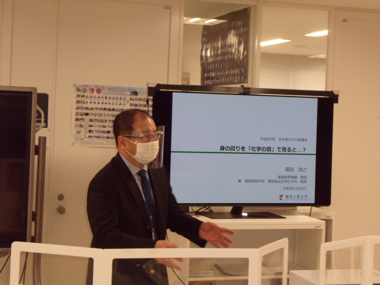 本学、基盤教育機構 兼 環境情報学部環境食品応用化学科 蔵田 浩之 教授による未来塾FUT公開講座「身の回りを「化学の目」で見ると・・・・?」を令和2年12月5日(土)に開催し、2名の方に参加いただきました。