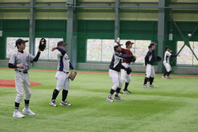 今回は大野市と本学による相互連携の一環で、大野市中学校軟式野球チーム「大野クラブ」のメンバーと小学6年生を対象に行いました。当日はあいにくの天候で福井工業大学カールマイヤーグランド室内練習場を使用して、大学生との合同ウォーミングアップから始まり、バッティング練習や守備練習、ピッチング練習などの指導を行いました。