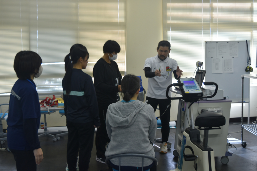 健常者の方における運動負荷試験と運動処方のための手順、運動時の呼吸ガス交換および心肺機能を学べるプログラムでした。