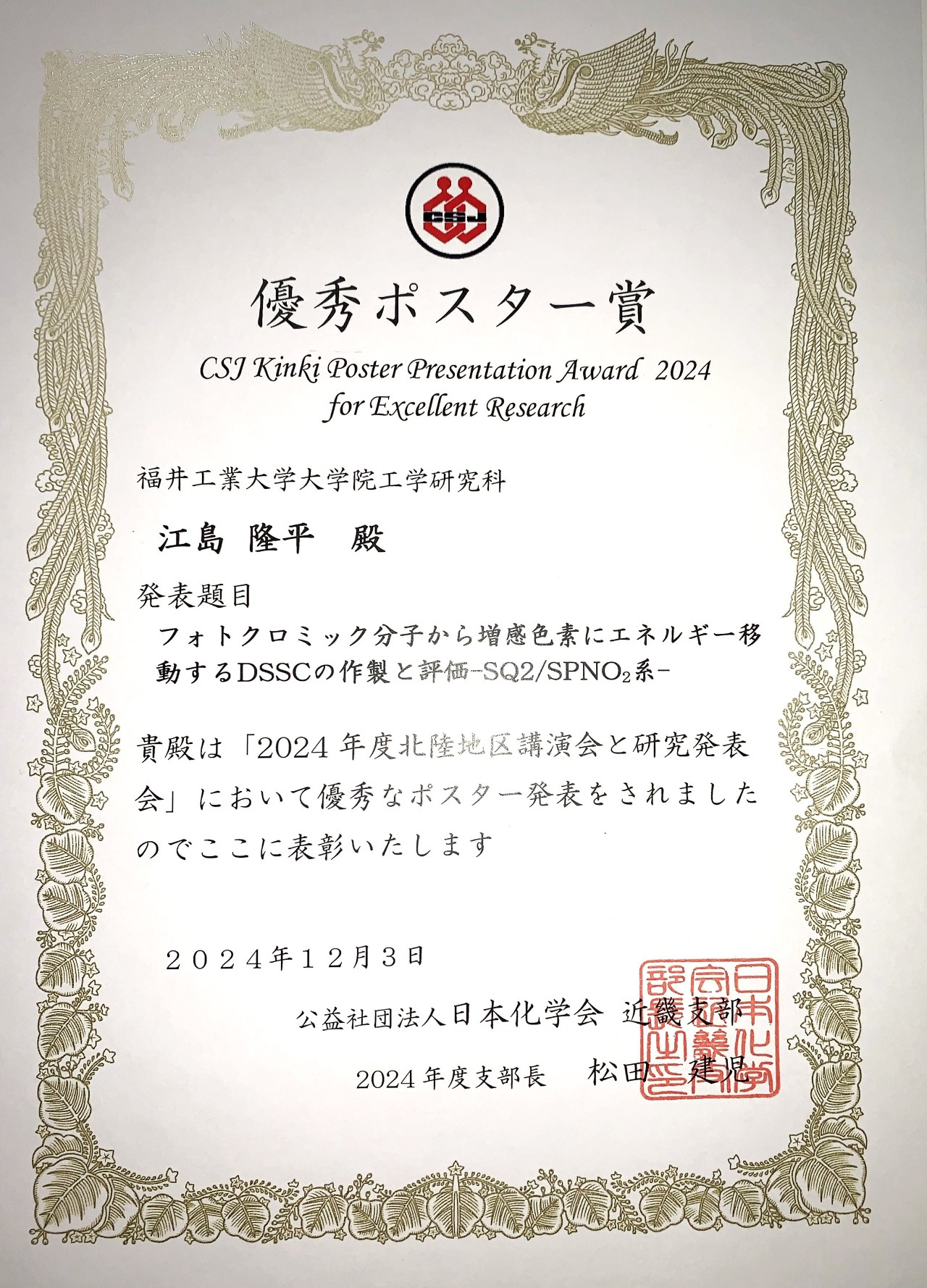 また、原研究室の博士前期課程工学研究科応用理工学専攻環境生命化学コースの福井工大附属福井高校出身の江島君は、日本化学会近畿支部主催の2024年北陸地区講演会と研究発表会において、「フォトクロミック分子から増感色素にエネルギー移動するDSSCの作製と評価-SQ2/SPNO2系-」というタイトルで、学部生の大野君(福井県立美方高校出身)らと共著の発表で、優秀ポスター賞を受賞しました。実験やゼミはもちろんのこと、研究室内で、議論などを重ねて、日頃から真摯に研究をし、討論を積んだ成果だと思います。 <リンク>
