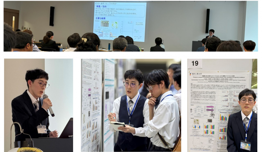大学や研究所の先生方、大学院生や博士研究員、若手・シニア研究者に交じって、当環境食品応用化学科の卒業研究生の下川玲央さん(科学技術高等学校出身)が、「模擬微小重力環境下のダイズの生長に及ぼす機構のプロテオミクス解析」について、堂々とフラッシュトークやポスター発表を行い、質問に対しても熱心に応答しました。さらに、英語や日本語のシンポジウムやワークショップを聴講し、知識を深めました。