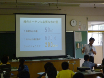今回、雨水を用いて「緑のカーテン」を育成している福井市東安居小学校で、7月15日(金)5年生対象に「総合学習」の時間を利用して、「正しいエコ活動とは何か?」について授業を行ってきました。