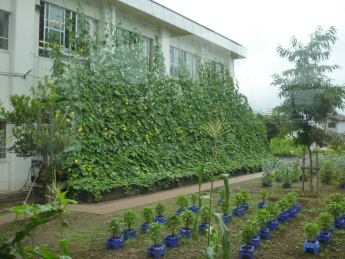 本学環境情報学部 環境・食品科学科 笠井研究室では、「緑のカーテン」の育成を通じて、環境保全に対する意識の向上、および環境負荷削減につながるエコ活動の重要性を児童生徒に分かりやすく伝える環境教育プログラムの開発に取り組んでいます。