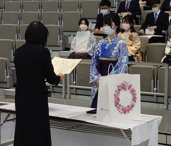 2022年3月15日(火)に、コロナ禍であるため、サンドーム福井にて、学位授与式が挙行され、その後、学科に分かれて、一人一人に、矢部主任教授から、学位記が手渡されました。