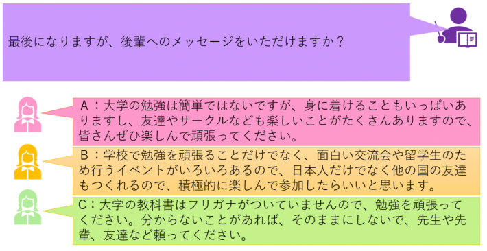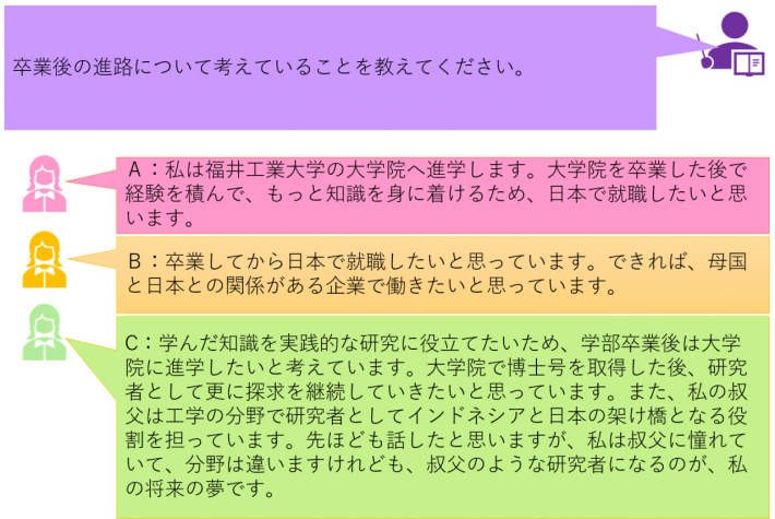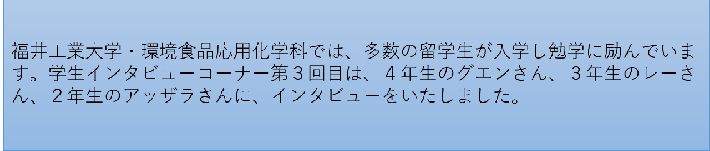 お知らせ NEWS & TOPICS トップページ お知らせ 環境食品応用化学科 環境食品応用化学科・学生インタビューコーナー<第3回> 2021.12.11 環境食品応用化学科・学生インタビューコーナー<第3回> 福井工業大学・環境食品応用化学科・学生インタビューコーナー<第3回> 福井工業大学・環境食品応用化学科では、多数の留学生が入学し勉学に励んでいます。学生インタビューコーナー第3回目は、4年生のグエンさん、3年生のレーさん、2年生のアッザラさんに、インタビューをいたしました。ぜひ、ご覧ください。 とある一日の生活<留学生編> お問い合わせ:環境食品応用化学科(小松) PREV 一覧に戻る NEXT