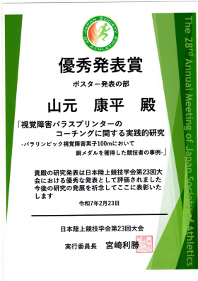 2025年2月22日(土)、23日(日)に仙台大学にて行われた第23回日本陸上競技学会大会において、スポーツ健康科学科の山元康平准教授(陸上競技部顧問)と内藤景教授(同監督)が、本学卒業生でパリ2024パラリンピック競技大会男子100m視覚障害T13クラスにおいて銅メダルを獲得した川上秀太選手(アスピカ)の取り組みをテーマとした研究発表を行い、ポスター発表部門の優秀発表賞を受賞しました。