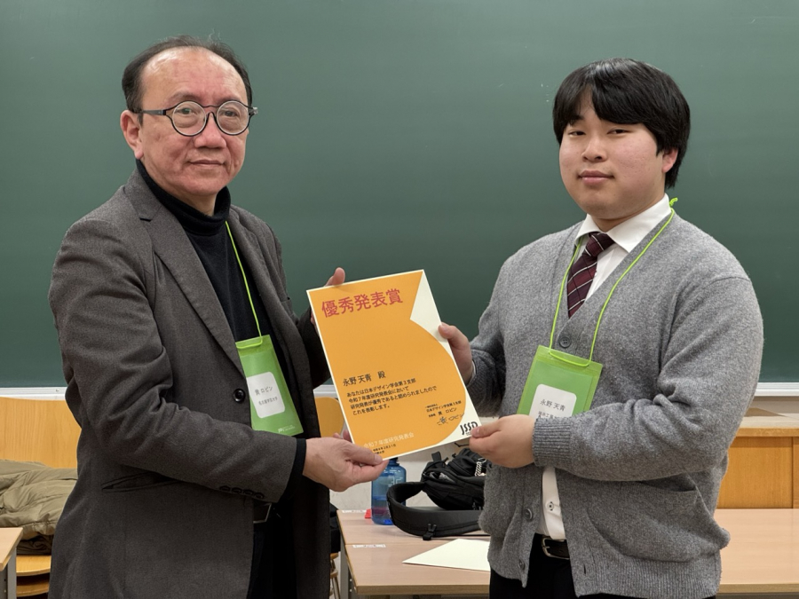 2026年2月21日に長野大学(上田市)で開かれた、日本デザイン学会第3支部研究発表会にて、本学デザイン学科都市デザインコース4年の永野天青さんが「アンサンブル!」と題した、音を鳴らさずとも合奏の楽しさを体感できる装置やシステムのデザインを発表し、ポスターセッション部門において優秀発表賞を受賞しました。