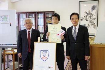 平成28年4月27日(水)本学学長室にて、「一般社団法人福井県サッカー協会」のエンブレムデザインの感謝状・記念品目録の贈呈式が行われました。