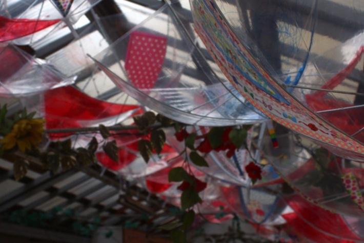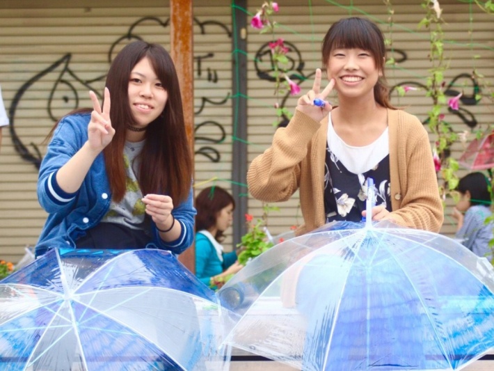 傘一本一本は紙やマスキングテープなどでデコレーションされ、すべてデザインが異なっており、デザイン学科学生だけではなく、地域の高校生やその保護者、小学生にも制作していただきました。
