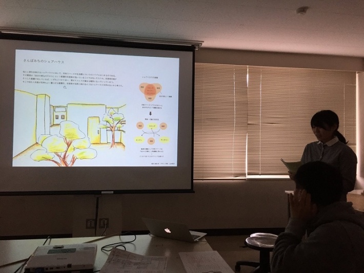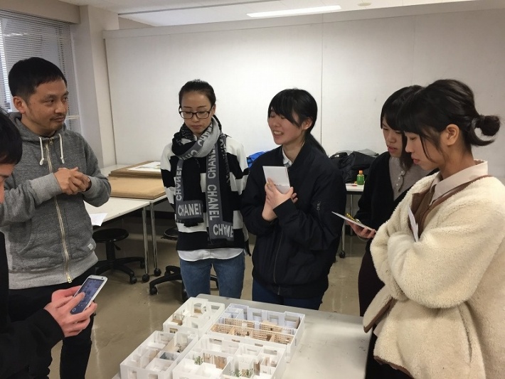1室を改修する提案では、デザイン学科3年生の元田彩音が最優秀賞(作品名:つなげる場所 趣味と土間がある暮らし)、シュセイが優秀賞(作品名:Different Space)、2室を一つの空間として改修する提案では、山本紫乃が最優秀賞(作品名:さんぽみちのシェアハウス)、清水香澄が優秀賞(作品名:ツミツク)と応募者4名全員が受賞するという高い評価を受けました。表彰式の最後には審査員から個別にアドバイスをいただき、今後の設計についてアドバイスをいただいていました。