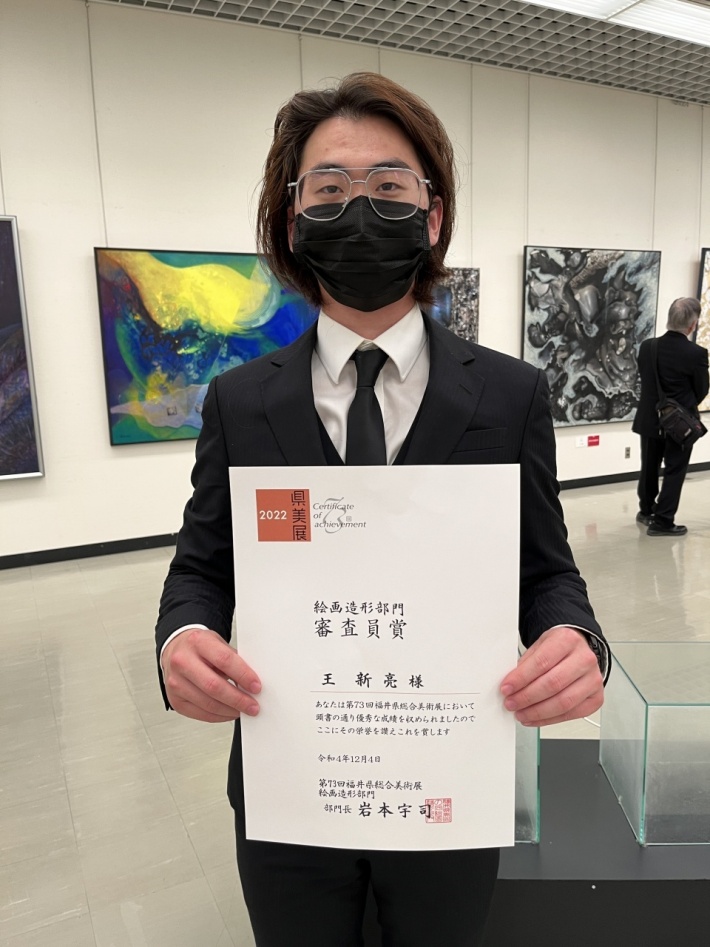お知らせ NEWS & TOPICS トップページ お知らせ 受賞・成果 【デザイン学科】大学院生が県美展審査員賞を受賞! 2022.12.08 【デザイン学科】大学院生が県美展審査員賞を受賞! 【デザイン学科】大学院生が県美展審査員賞を受賞! 社会システム学専攻デザイン学コースの大学院生オウシンリョウ(藤田大輔研究室)が福井県総合美術展(県美展)に出展し、絵画・造形部門で入選および審査員賞を受賞しました。作品名は「水震光」です。 霧が出る量やタイミングを調整し、3つのガラスのフレーム内部および周辺に表情豊かな震える水と光を表現しています。 --- 第73回福井県総合美術展 「県美展」 会場:福井県立美術館 前期 11月23日(水・祝)~27日(日) 後期 11月30日(水)~12月4日(日) お問い合わせ:デザイン学科 PREV 一覧に戻る NEXT