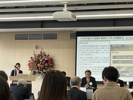 学生プレゼンテーションでは、工学部 建築土木工学科 4年 西川可純さん(宮本研究室)が「1948年福井大地震の教訓から学ぶ地震防災」と題して、福井震災の被害と地盤の関係の解明及び人工衛星データによる水害浸水域の評価について発表しました。