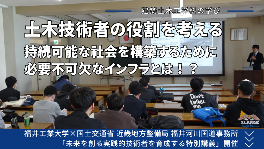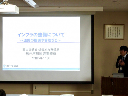 2023年11月30日(木)、工学部建築土木工学科で開講している講義の交通計画において、国土交通省 近畿地方整備局 福井河川国道事務所長の橋本亮氏をお招きし、「インフラの整備について~道路の整備や管理など~」をテーマにした講演をしていただきました。