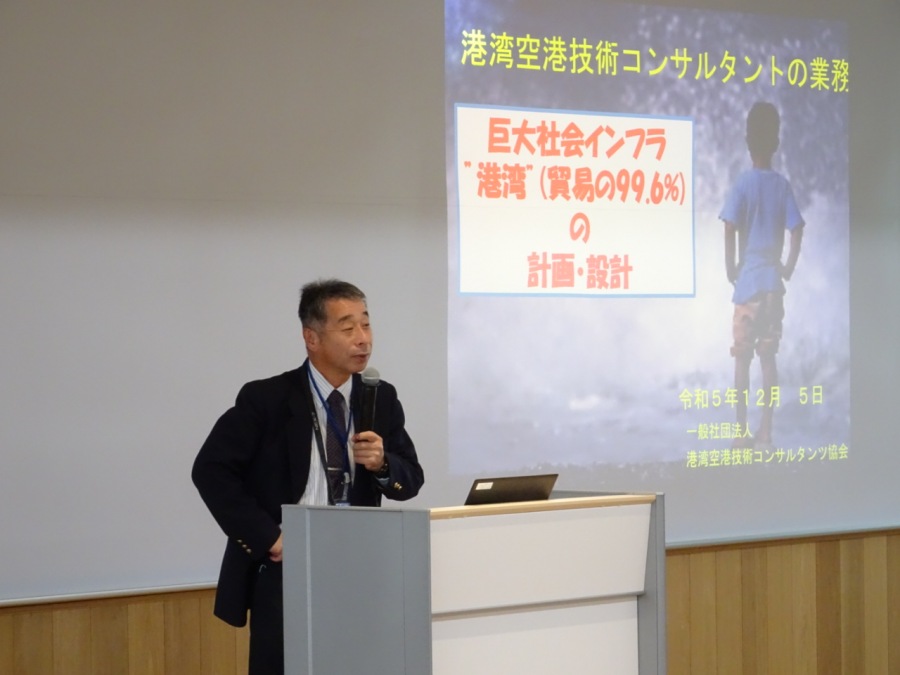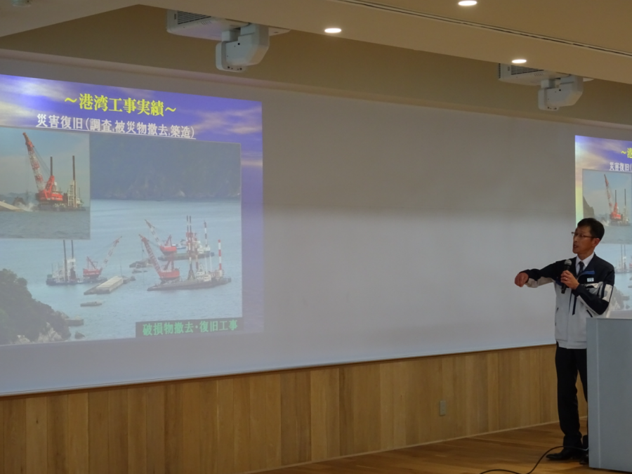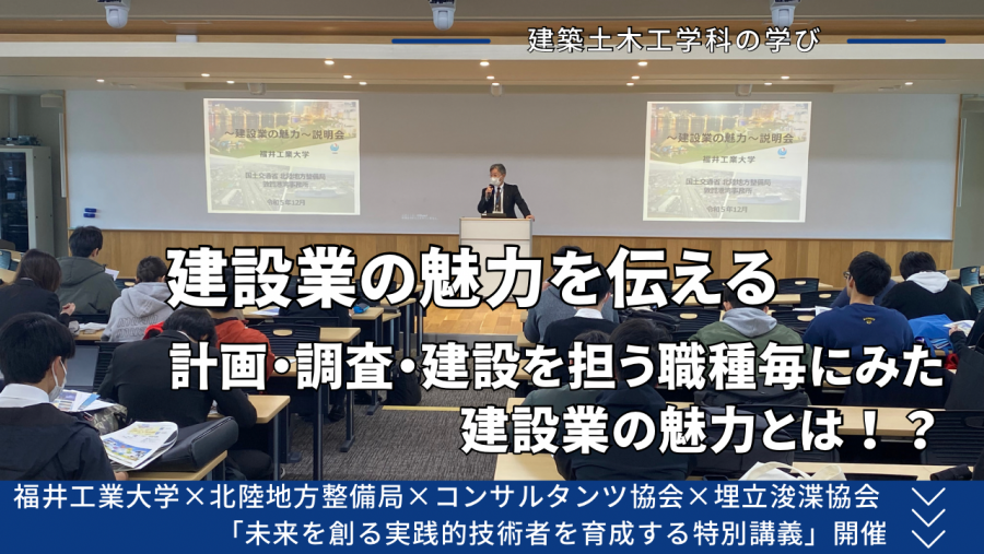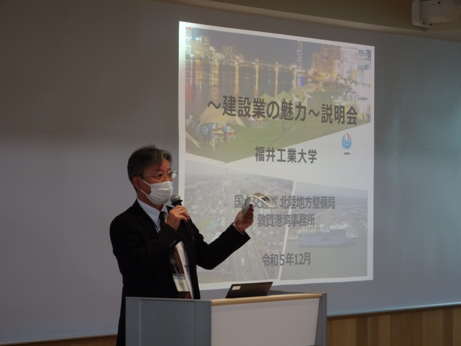 2023年12月5日(火)、工学部建築土木工学科で開講している講義の建築土木ゼミナールにおいて、国土交通省北陸地方整備局敦賀港湾事務所、港湾空港技術コンサルタンツ協会、日本埋立浚渫協会北陸支部との協働により、「建設業界の魅力」をテーマにした説明を行いました。