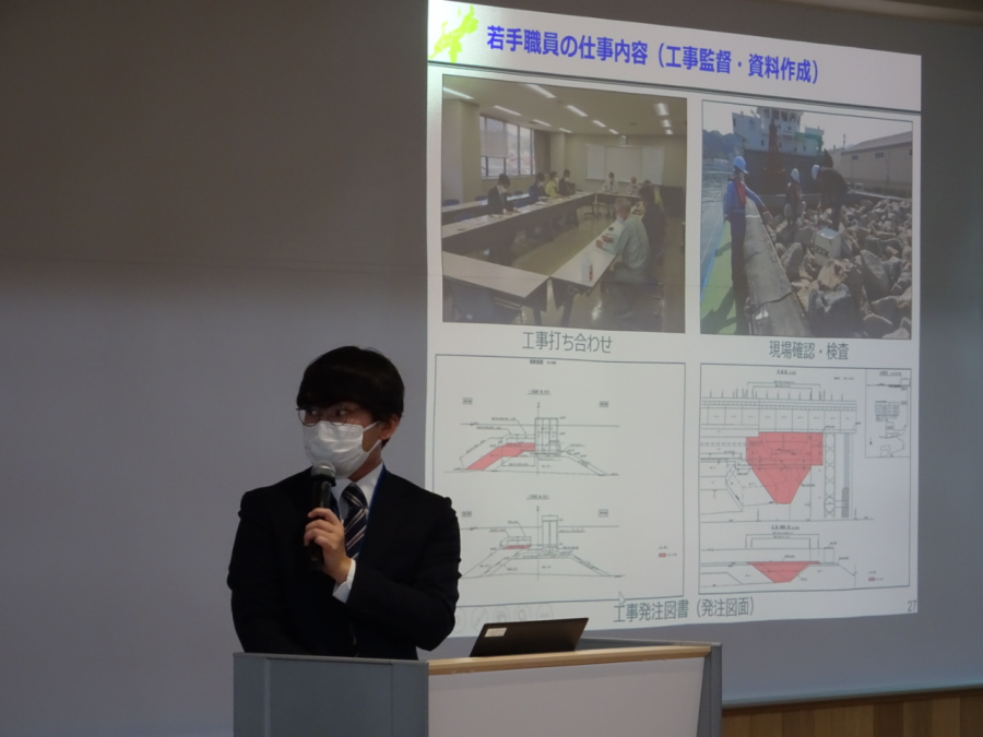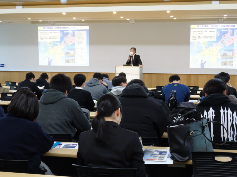 北陸地方整備局から「建設業における公務-社会インフラ整備-」、(一社)港湾空港技術コンサルタンツ協会から「港湾空港技術コンサルタントの業務」、(一社)日本埋立浚渫協会から「建設業界の技術者の役割」について、お話いただきました。講演後には、参加した学生からの質問に対して、丁寧にお答えいただきました。