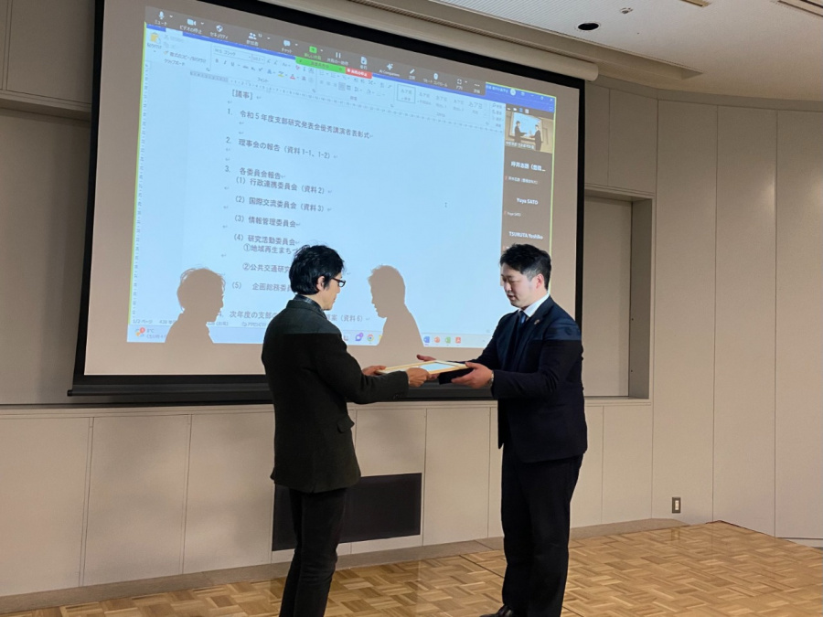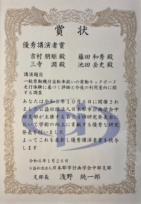 2024年1月26日(金)に名古屋都市センターにて開催された令和5年度支部研究発表会優秀講演者表彰式にて、日本都市計画学会中部支部の浅野純一郎支部長から賞状が授与されました。