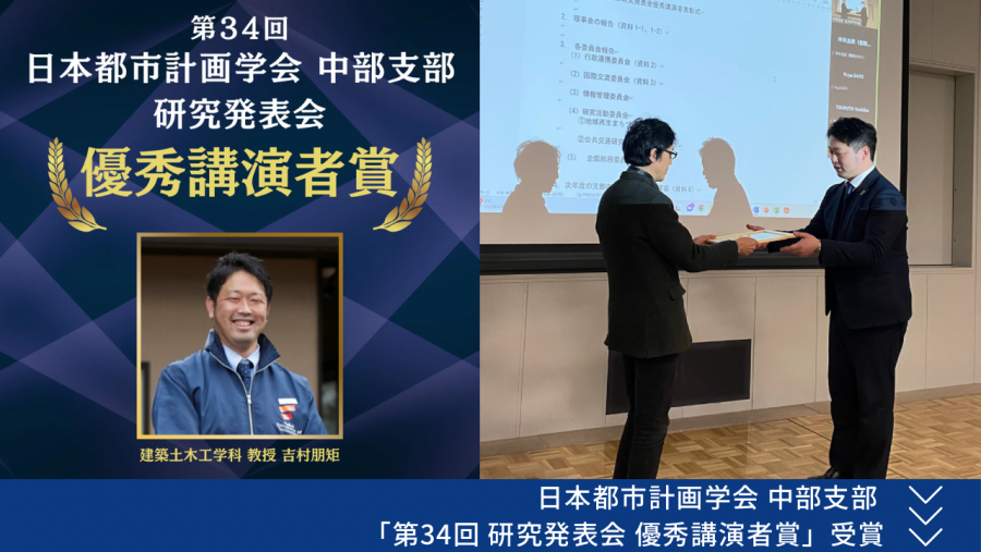 2023年10月6日(金)に開催された日本都市計画学会中部支部第34回研究発表会において、工学部建築土木工学科の吉村朋矩教授が「優秀講演者賞」を受賞しました。