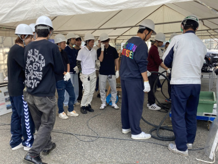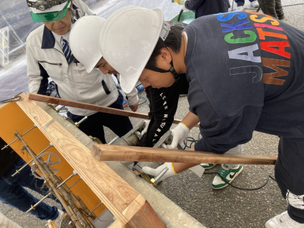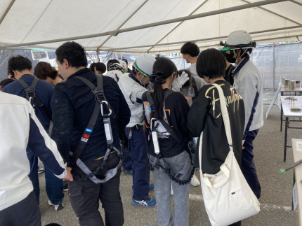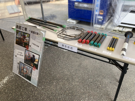 その後、DBヘッド鉄筋やガス圧接継手、型枠、セパ、バイブレータ、フルハーネス安全帯等、現場で実際に使われている材料や器具等を、見学用に展示していただきましたので、実際に手に取ったり器具を使う体験をしながら、それらの特徴や使い方などの説明を受けました。