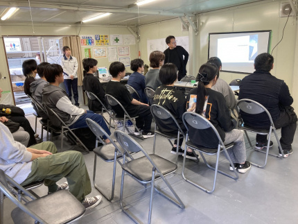 まず、本物件の設計・監理を担当されている(有)藤田建築設計事務所の藤田所長より、設計事務所の実績の紹介や本建築のコンセプトなどをお聞きし、施工担当の技建工業(株)山石所長はじめ現場スタッフの方々より、建設業の仕事の概略、工程表や施工図の説明がありました.