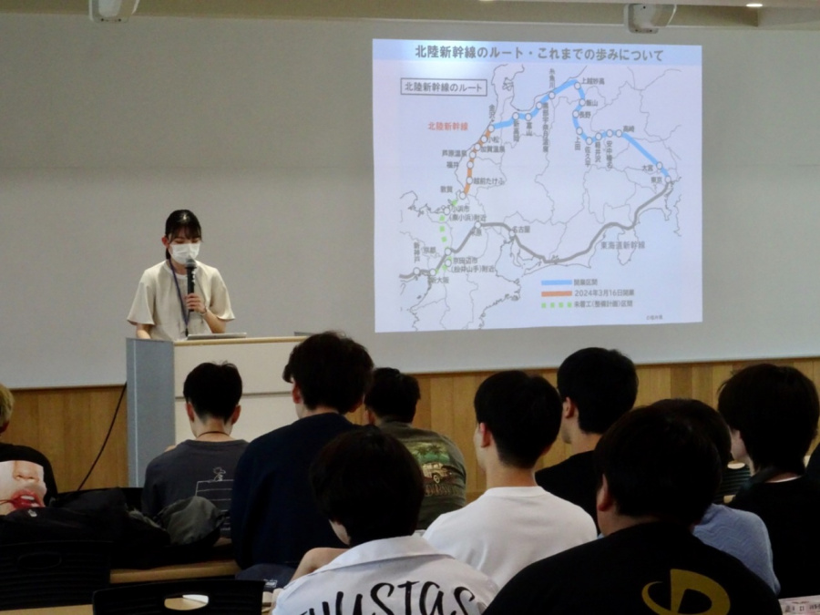 学生たちは、福井県内には多様な移動手段があることを学び、持続可能な暮らしや観光を実現させていくために、どのような移動手段が必要か、北陸新幹線の県内開業後の交通・まちづくりの現状と今後の動向を通して学んでいきました。
