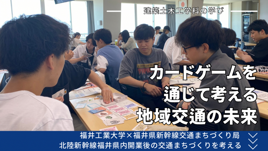 福井県未来創造部新幹線・交通まちづくり局と協働で、福井県が製作した福井の公共交通を学ぶカードゲーム「のってこふくい」を活用したワークショップを実施しました。建築土木工学科の学生79名が受講する「建築土木概論」のなかで、吉村朋矩教授が担当する「次代を見据えた交通まちづくり」をテーマにした講義回で行ったものです。