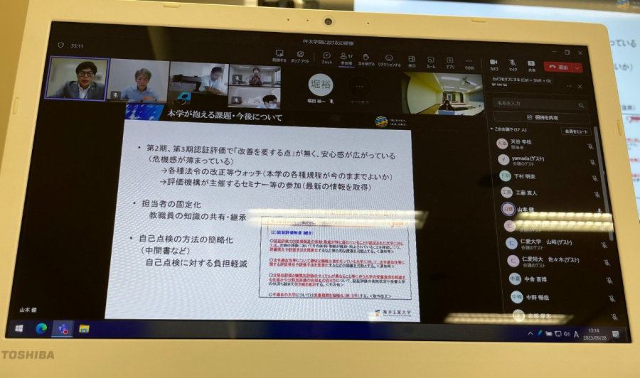 令和5年9月28日(木) 13時から14時半まで、職員対象研修会をオンラインにて開催しました。福井県産学官連携プラットフォームふくいに加盟する高等教育機関に加え、自治体関係者 約20名が参加しました。
