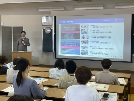 本学の教育、研究活動の取組みや、学生への就職支援体制・取組みなどをご紹介させていただき、保護者の皆様は時折、頷きながら聞き入ってくださいました。説明後は、見学ツアーを実施し本学での教育環境、教育施設を見ていただきました。