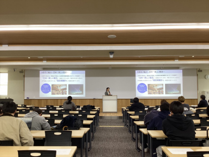 講義冒頭、大野市の概要として人口、世帯数、面積、風景等「結の故郷 越前おおの」についてご紹介されました。